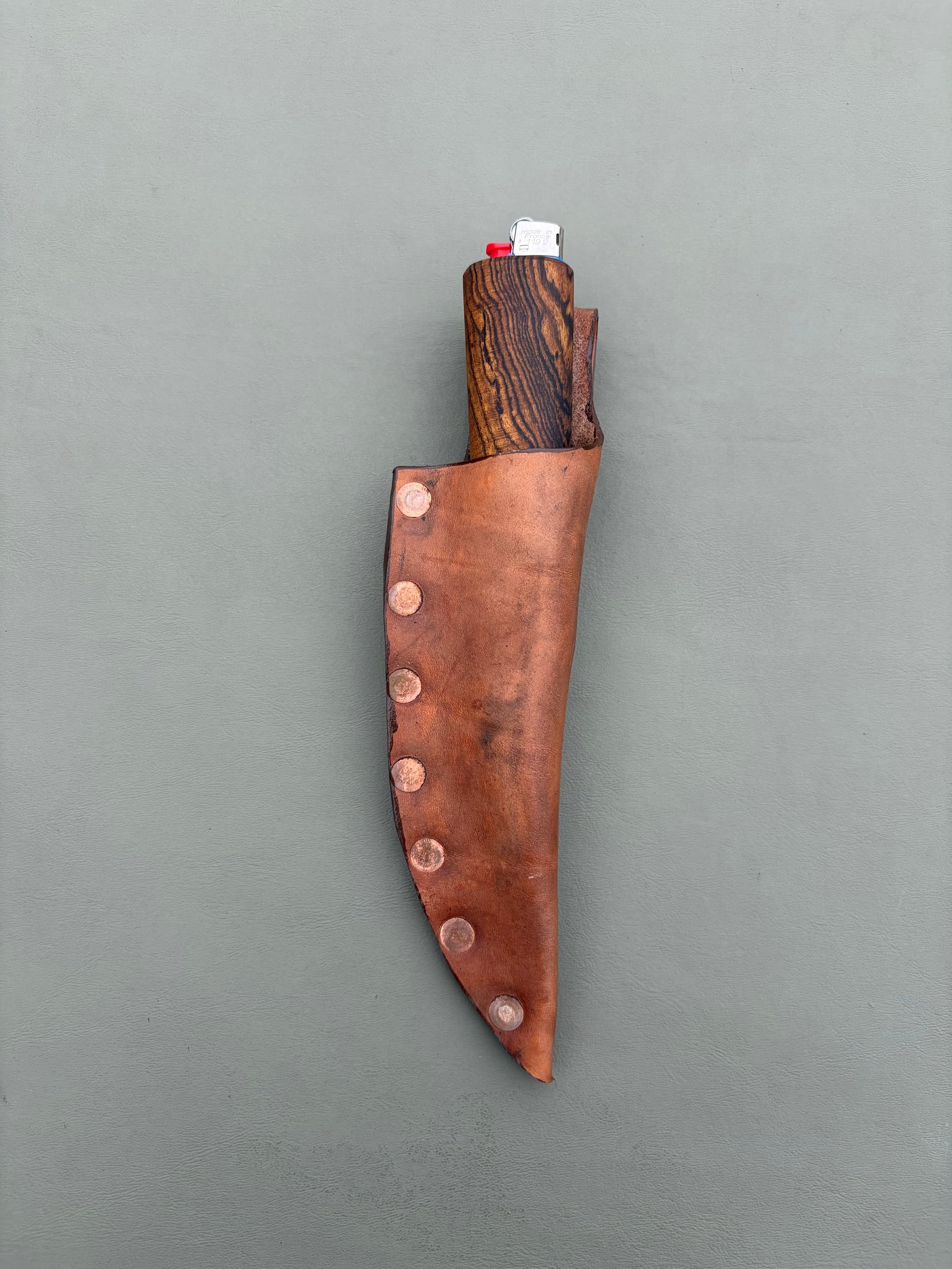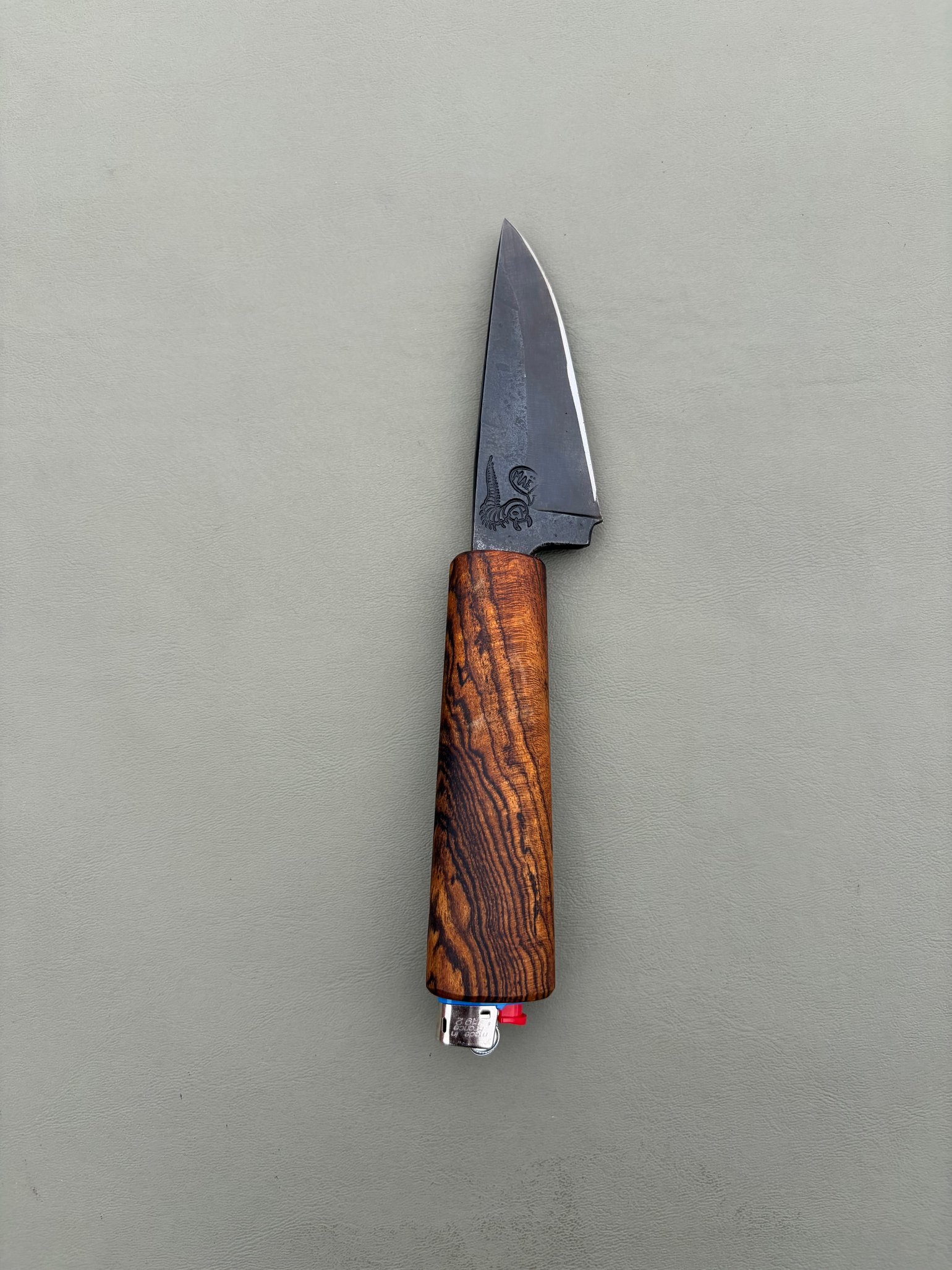 Blade 3” oal 8”. Bocote handle holds small bic lighter