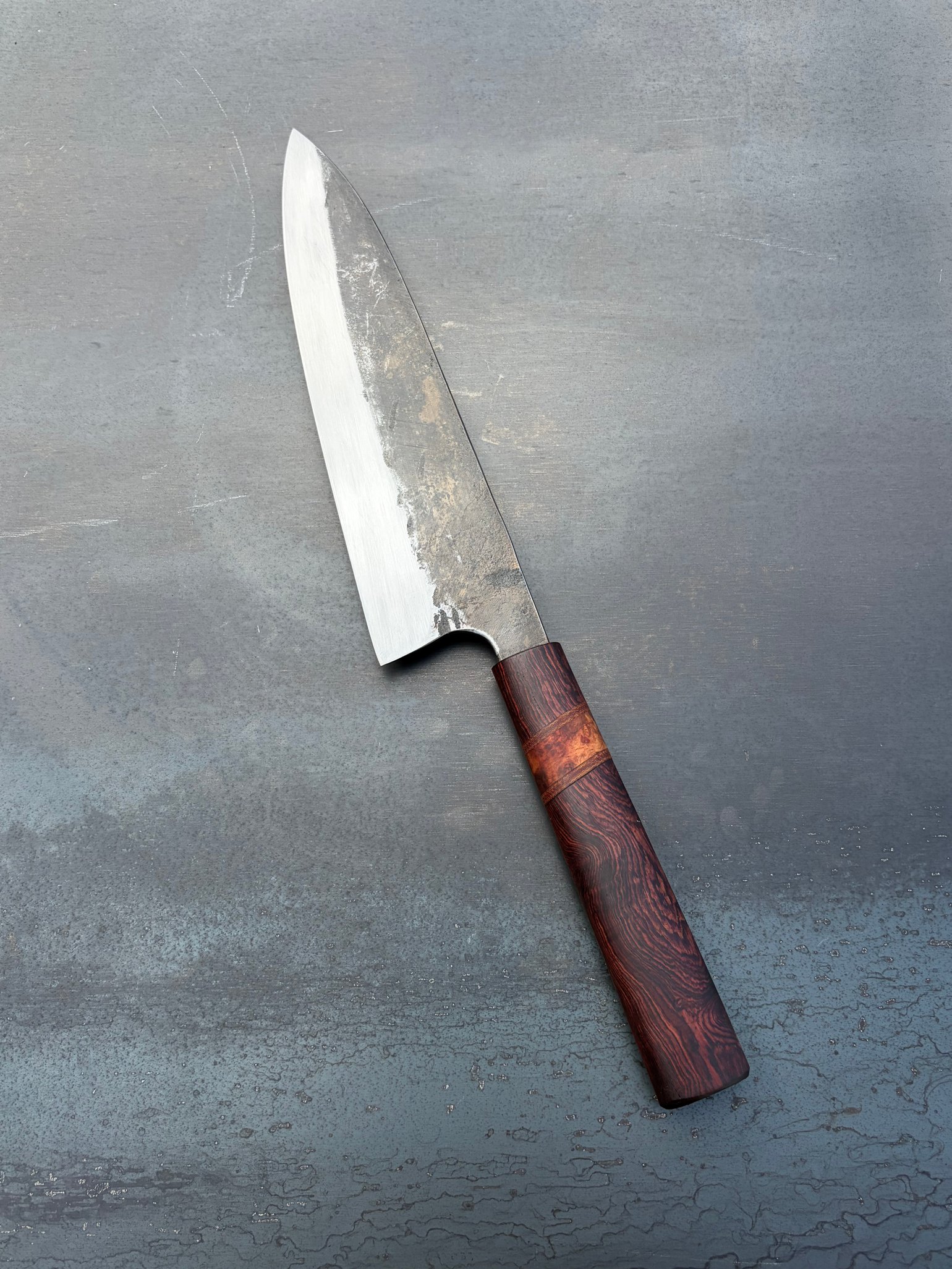 Engraved Kelp blade. 26c3 alloy. Mexican Kingwood, Amboyna Burl, micarta handle 8.5” blade 14.5” overall length.
