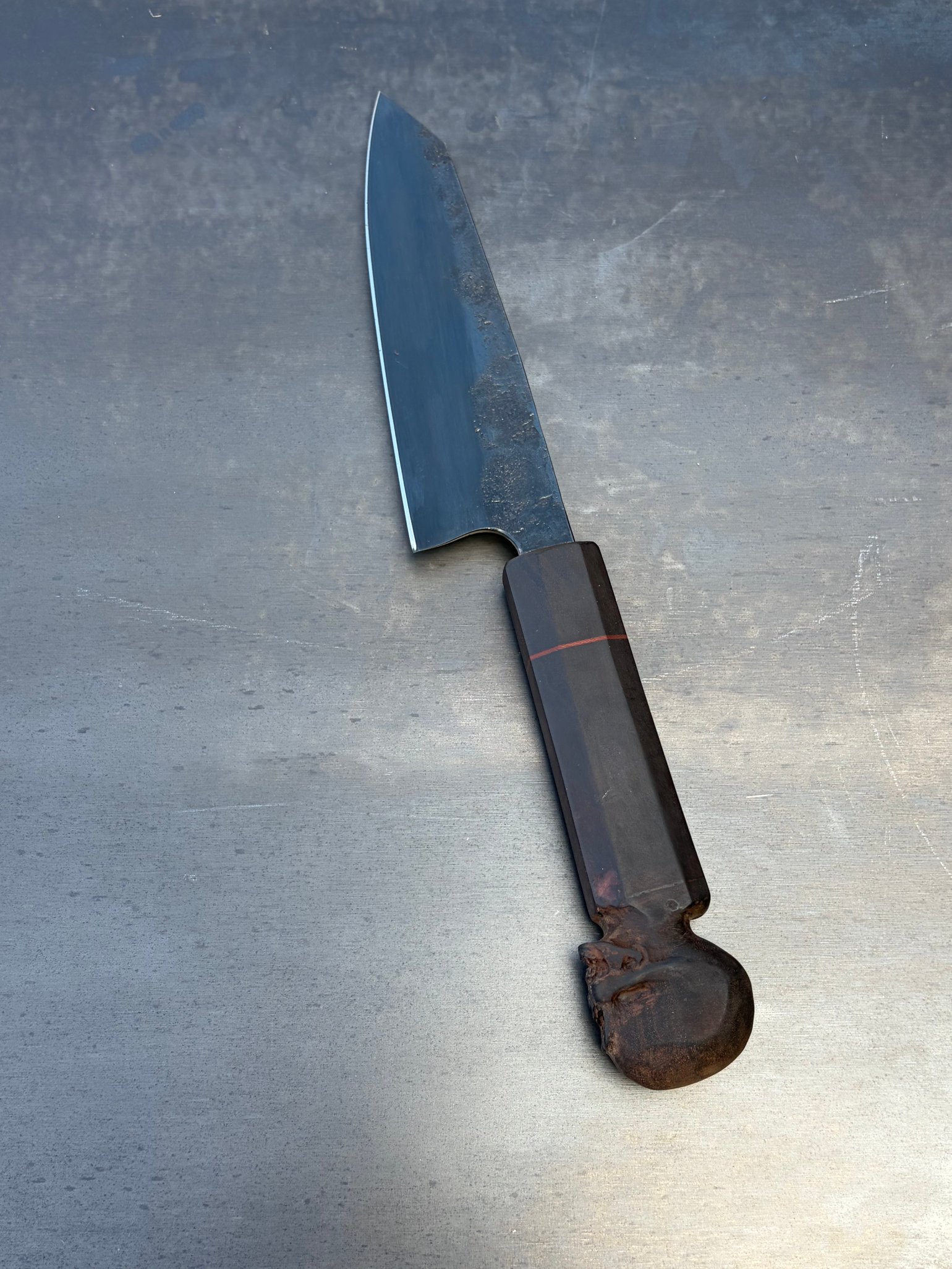 6” blade 12” overall length. Stabilized eucalyptus handle with carved skull